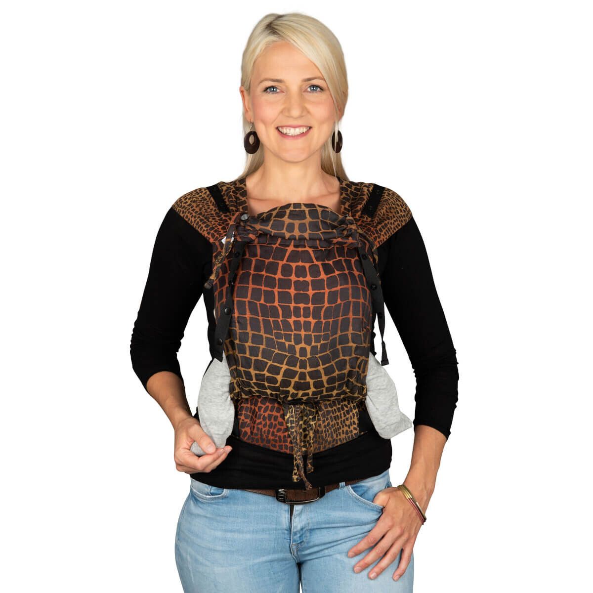 De Primeo is de eerste fullbuckle draagzak waarvan je de gespen al kunt vastklikken, omdoet en dan pas je kindje erin zet. Dit geeft een veilig gevoel. Zo is het ook makkelijker om ergens anders de draagzak om te doen, want hij is heel makkelijk in gebruik.