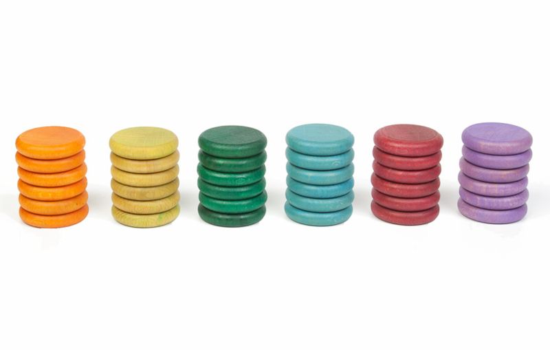 De houten munten van het Spaanse speelgoed merk Grapat zijn op veel manieren te gebruiken tijdens het spelen. De houten munten helpen je kindje in het ontdekken van spel: sorteren, tellen, rollen, stapelen gebruiken in bouwwerken met ander houten speelgoed, de mogelijkheden zijn eindeloos. Deze 36 munten hebben 6 kleuren.
