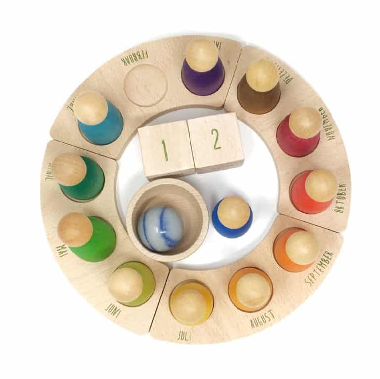 Deze jaarring van het Spaanse speelgoed merk Grapat is een kalender die je kindje helpt met het begrijpen van de maanden, datum, tijd en de seizoenen. Deze set heeft een houten ring die bestaat uit 4 delen, hier op staan de maanden in het Duits. Verder komt deze set met 12 Nins houten poppetjes, 2 houten blokjes met getallen en een houten bakje. De poppetjes kun je in de ring verplaatsen naar een nieuwe maand zoals hij het Waldorf principe.