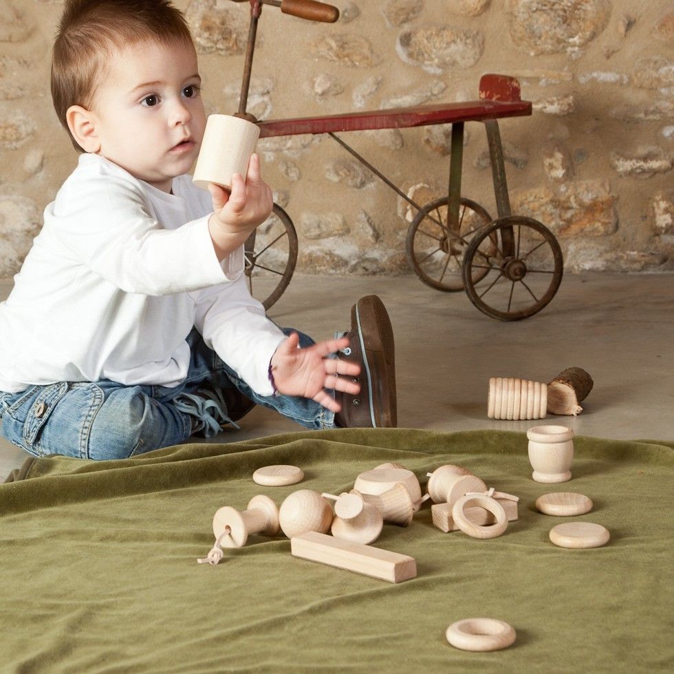 Speelgoed set met 20 elementen gemaakt van hout en afgewerkt met natuurlijke wax, inclusief een stoffen opbergzakje. Deze set van het Spaanse houten speelgoedmerk Grapat leent zich uitstekend om je kindje kennis te laten maken met het ontdekken van vormen en wat je daar mee kunt doen.
