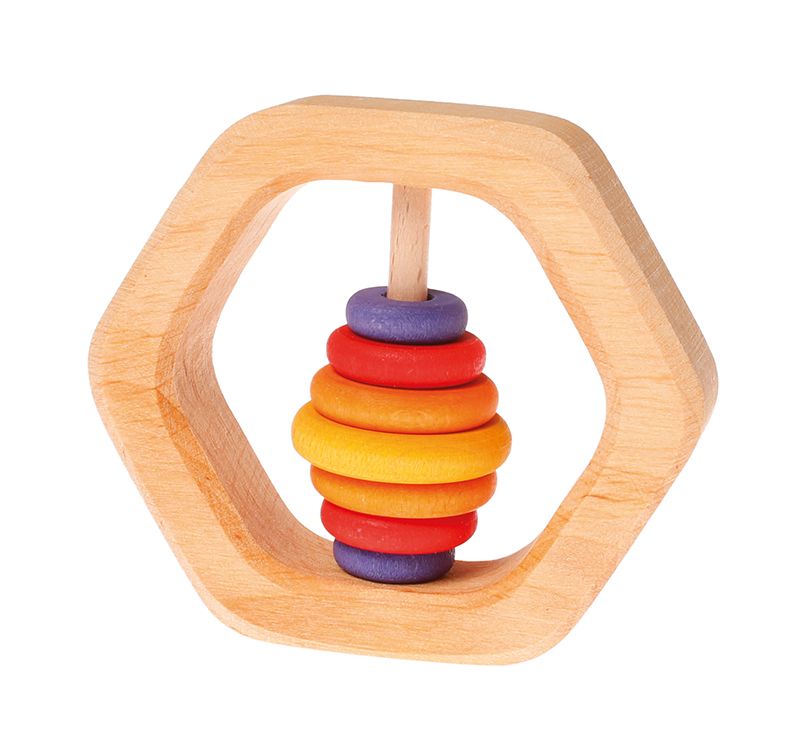 De zeshoekige rammelaar van Grimm's is gemaakt vam lindehout en is ca 10 cm.